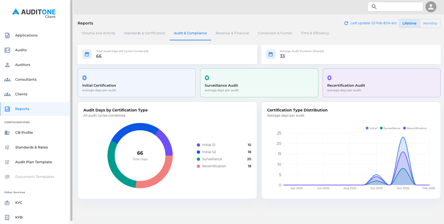 ISO OS is an end-to-end platform for certification bodies (CBs) to manage audits, client onboarding, planning & scheduling, auditor assignment, evidence collection, reporting, certificate issuance, and billing, with optional AI assistance. The entire certification cycle is covered with streamlined processes and efficient communication enablement.
